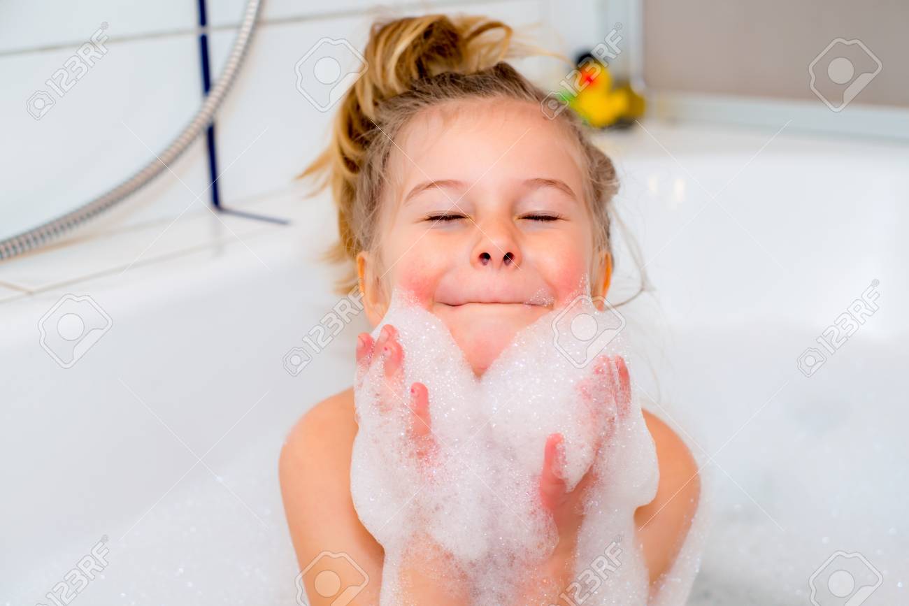 Immagini Stock Bambina Divertente Con Vasca Di Schiuma Nella